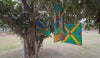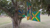 A fusion of color and symmetry, this piece draws the eye with its bold crossing paths of yellow and green, anchored by vivid blue fields and red geometric gems. The textured surface gives it a handcrafted depth, while the hanging chain contrasts with a modern metallic touch. It’s a visual story of balance, direction, and vibrant expression.